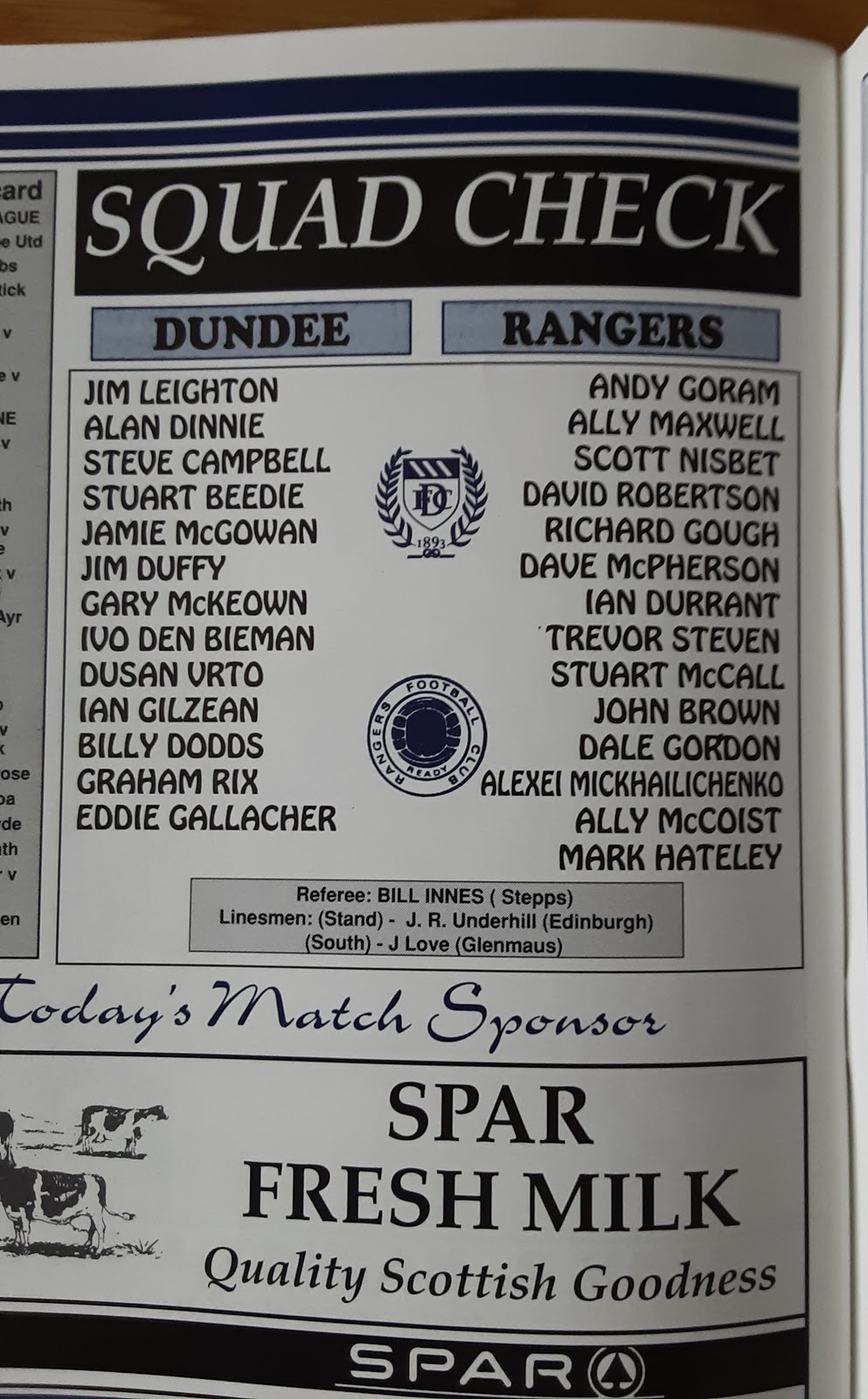 Dundee beat Rangers 4-3 in a entertaining game at Dens, Ivo Den Bieman, Ian Gilzean and Billy Dodds (2) got the goals for the Dark Blues in front of 12,087 fans.